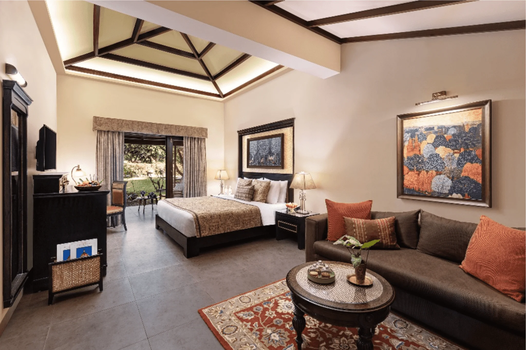 The Riverview Retreat, nestled on the tranquil banks of the Kosi River in Jim Corbett, provides a serene escape into nature’s lap. Spread across 8 acres, the property features villa-styled accommodations that blend seamlessly with the lush foliage, ensuring guests feel connected to the natural beauty surrounding them. Each villa offers modern amenities while maintaining a rustic charm, allowing for a comfortable yet immersive experience. These private villas come with individual lawns, balconies, and dining spaces, providing guests with a sense of privacy and exclusivity.